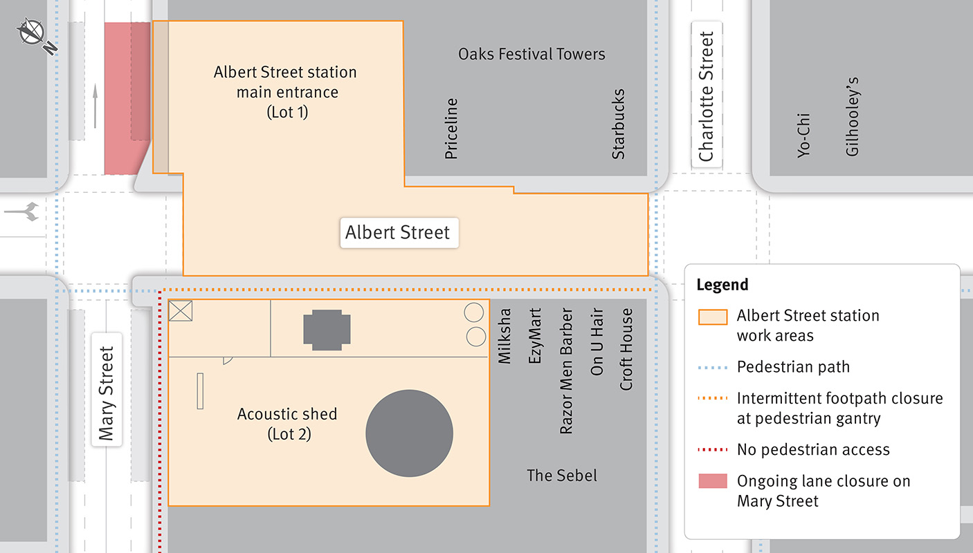 • Pedestrian access will be maintained on the opposite side of Mary Street. The pedestrian footpath in front of the Lot 2 acoustic shed will remain closed