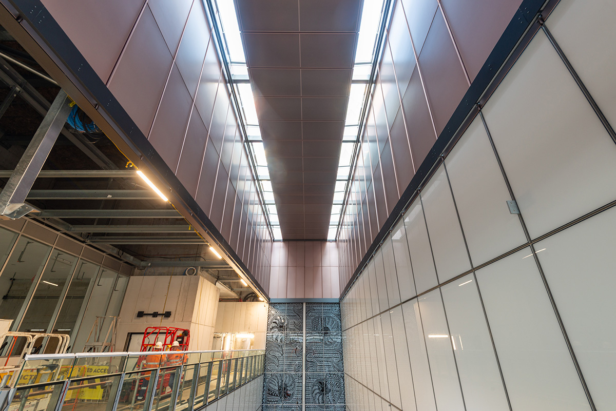 With the station roof structure now complete, the team are focused on the final finishes of the main station entrance building including metal roof cladding, architectural louvers and an aluminium wall extending from the canopy to the top of the roof. These works will occur during both day and night shift.